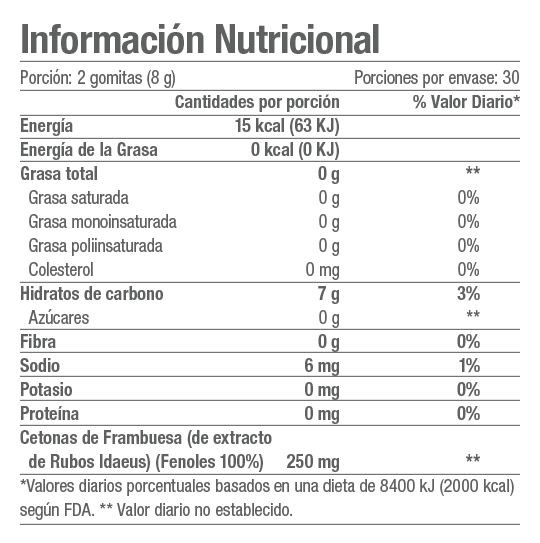 Las cetonas de frambuesa ayudan a la producción de adiponectina, hormona que acelera el metabolismo favoreciendo la utilización de las reservas grasa, además actúa como un inhibidor del apetito y tiene efecto termogénico.